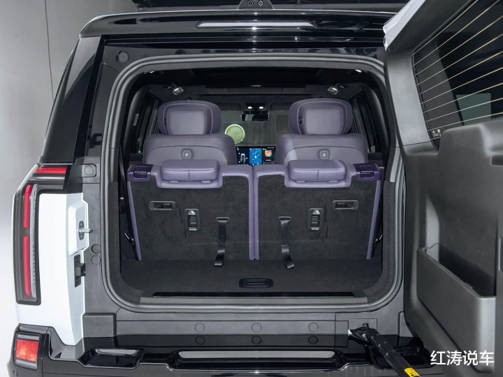 极石ADAMAS的长宽高分别为5050*1985*1856毫米,轴距为3010毫米,定位中大型SUV,这样的尺寸有着一定的存在感,无论停放在哪里,总会让人忍不住多看几眼,车身轮廓和极石01保持一致,黑色悬浮式平顶设计颇有豪华SUV的范儿,配备全新造型的21英寸黑色大轮毂,而熏黑尾灯点亮效果不错,采用侧开式尾门,外挂式备胎,此外前后排均是多层隔音玻璃,后排是隐私玻璃,具备拖挂资质。